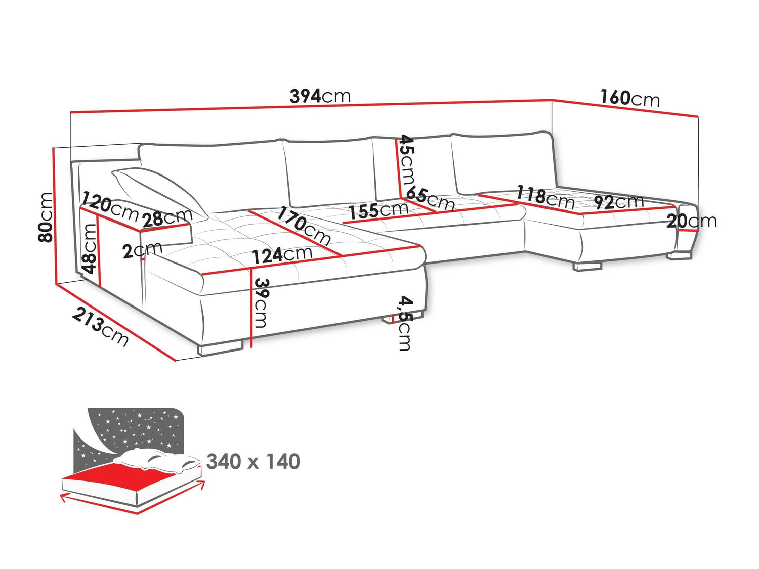 A fekvőfelület hossza340 cm