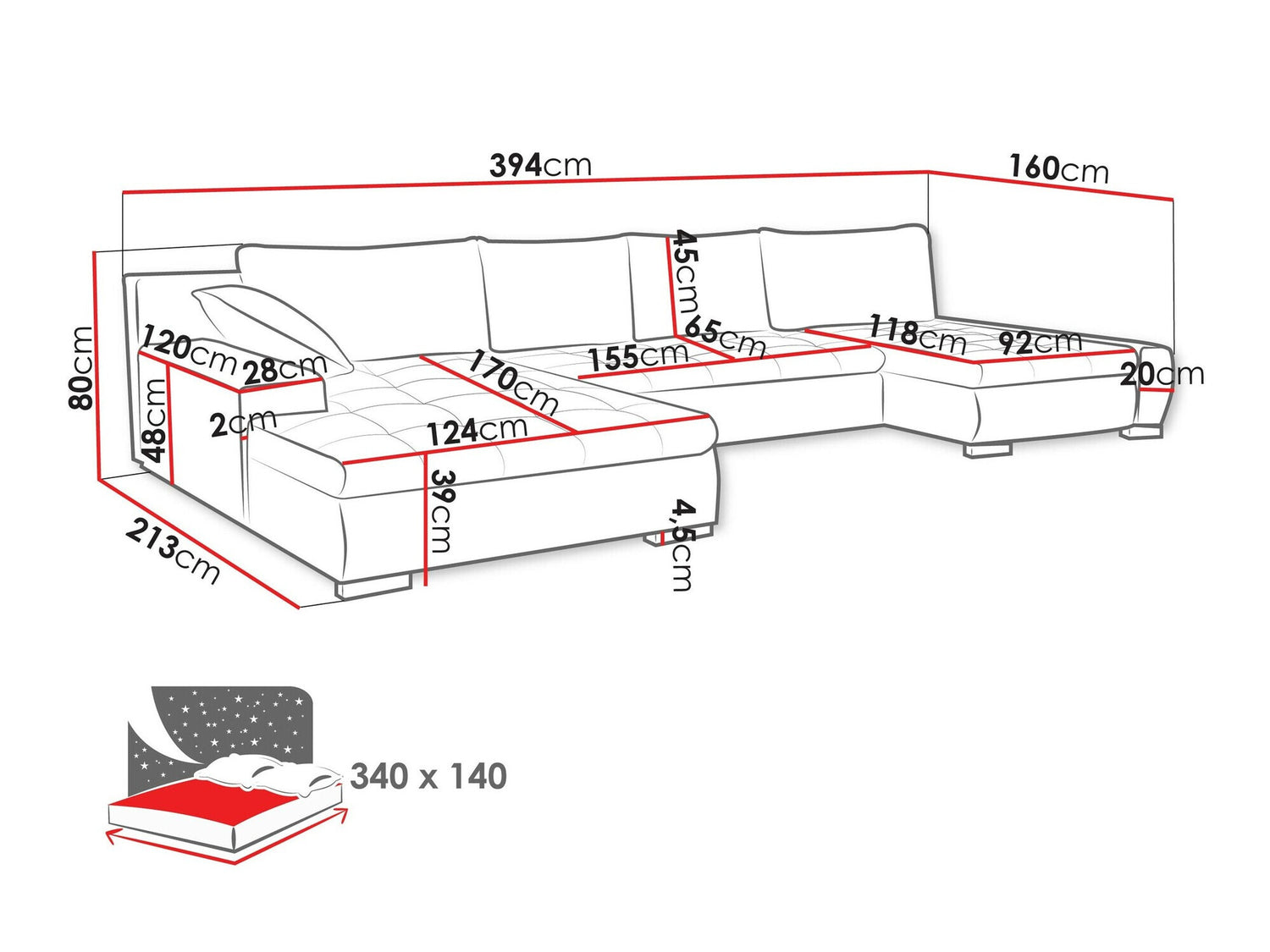 A fekvőfelület hossza340 cm
