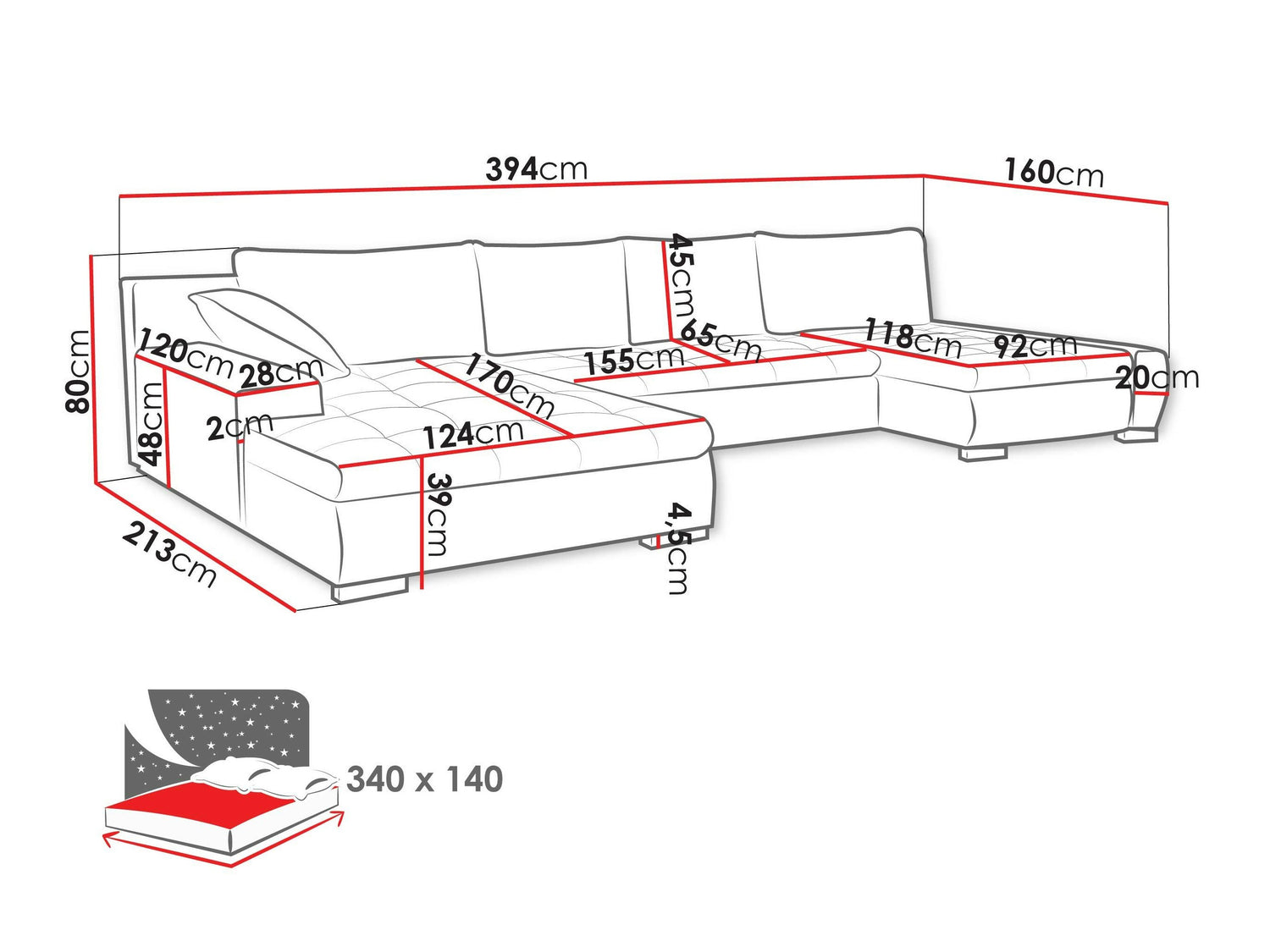 A fekvőfelület hossza340 cm