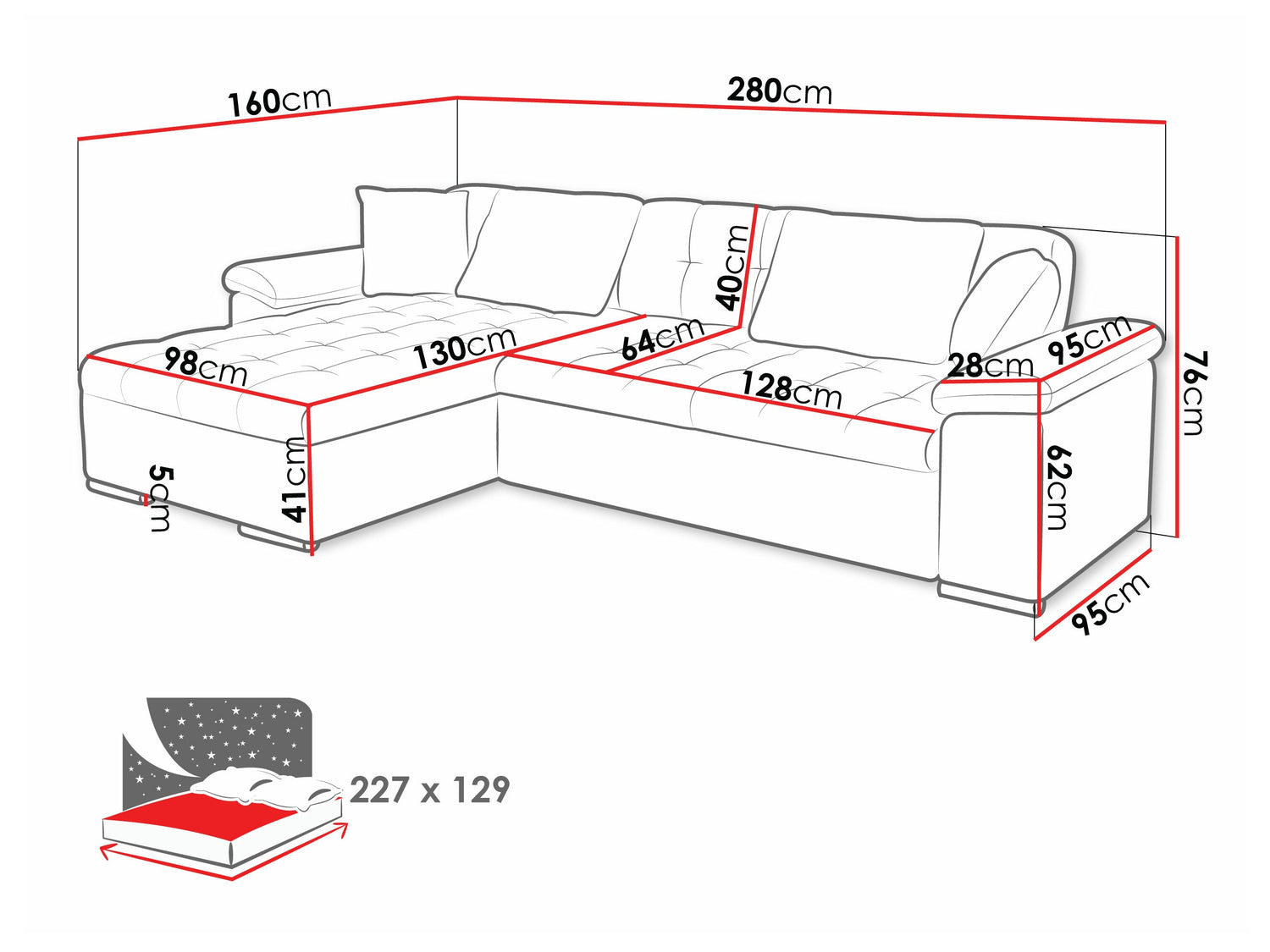 A fekvőfelület hossza227 cm