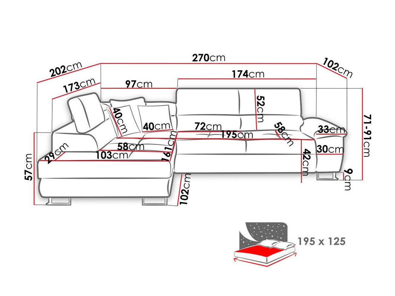 A fekvőfelület hossza195 cm