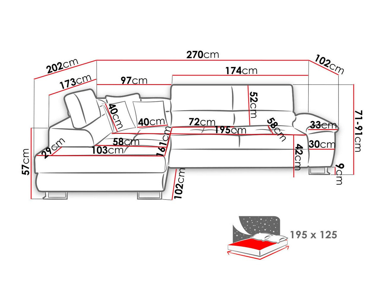 A fekvőfelület hossza195 cm
