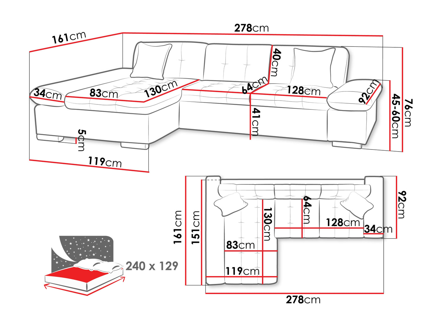 A fekvőfelület hossza240 cm