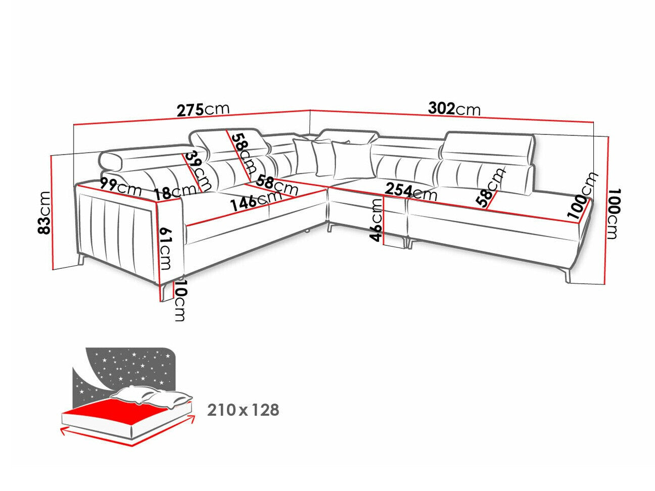 A fekvőfelület hossza210 cm