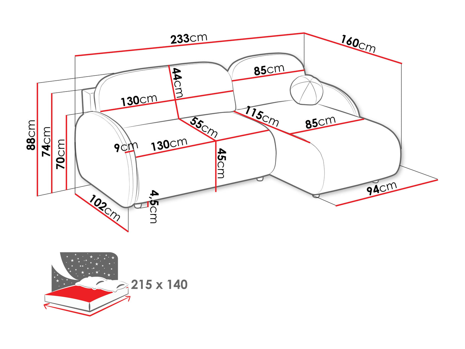 A fekvőfelület hossza215 cm