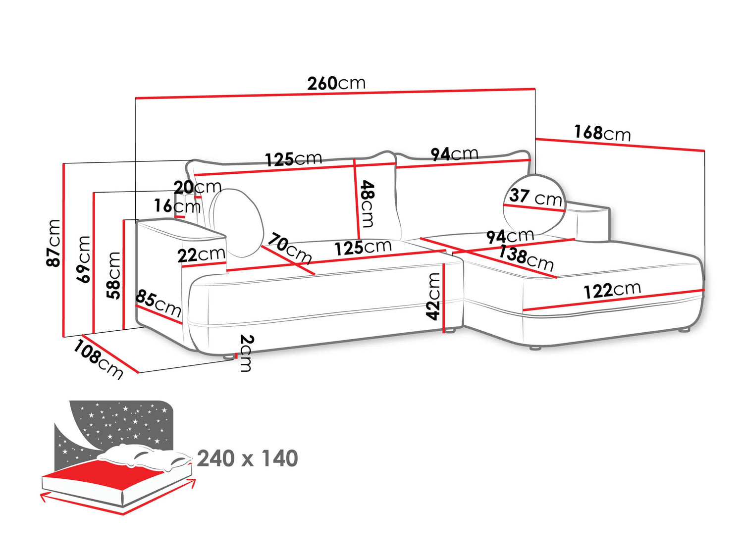 A fekvőfelület hossza240 cm