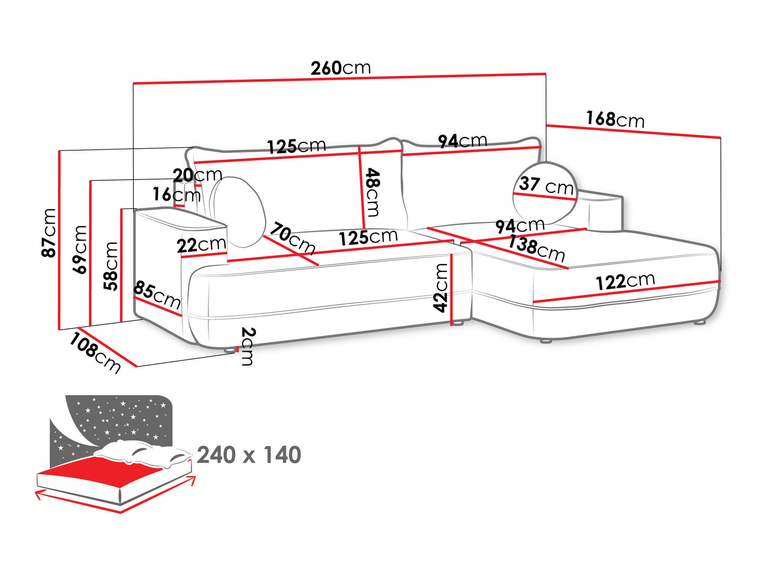 A fekvőfelület hossza240 cm