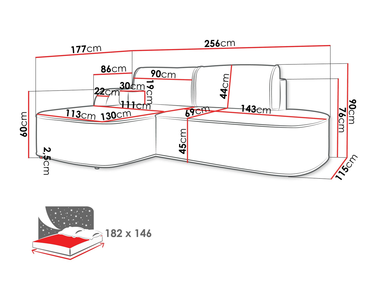 A fekvőfelület hossza182 cm