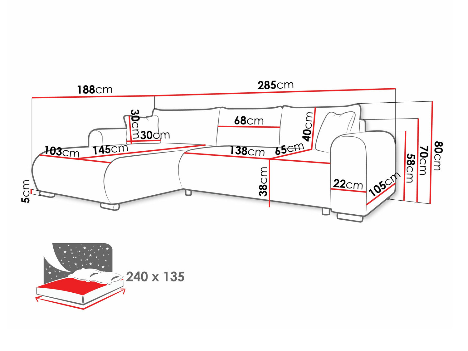 A fekvőfelület szélessége135 cm