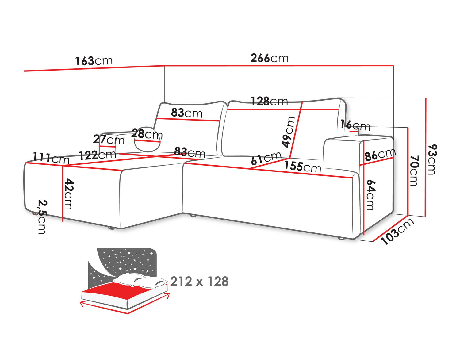 A fekvőfelület hossza212 cm