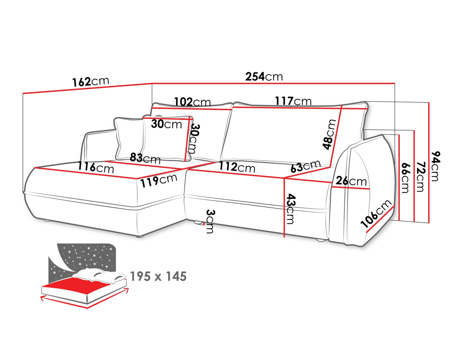 A fekvőfelület hossza195 cm