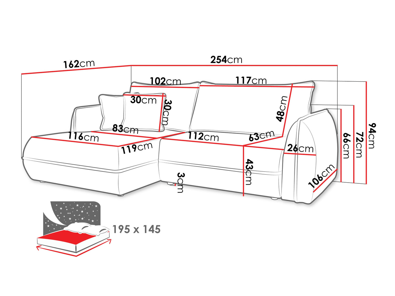 A fekvőfelület hossza195 cm