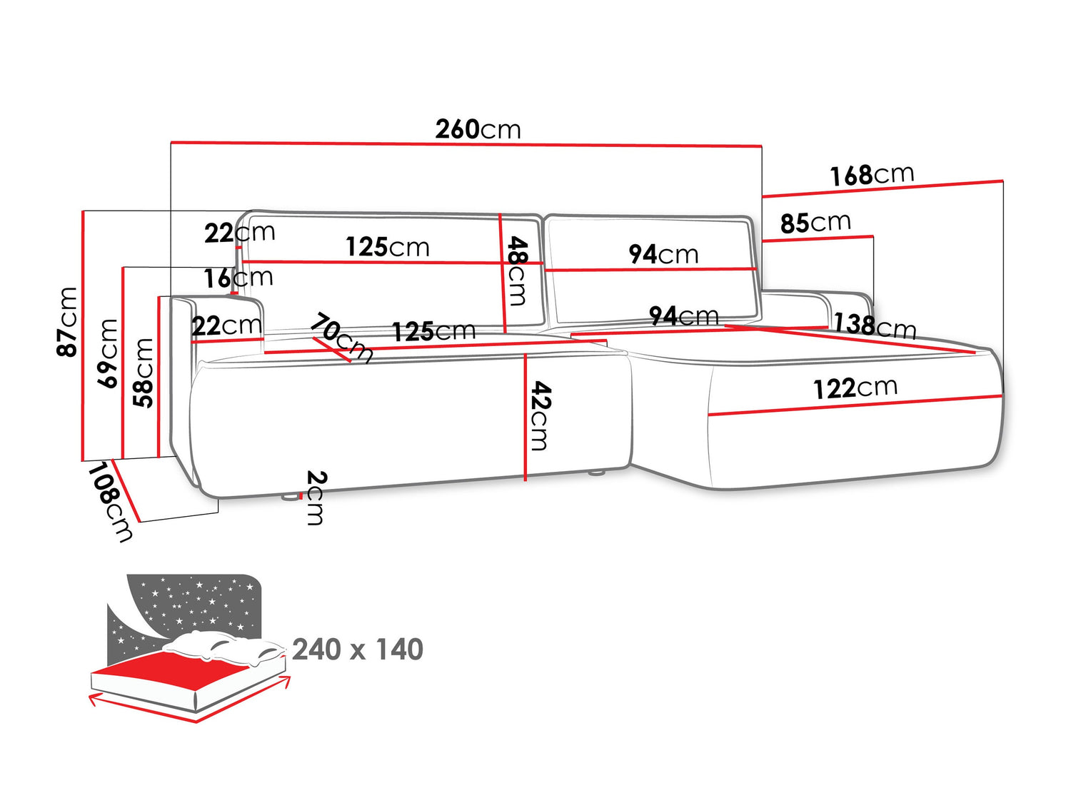 A fekvőfelület hossza240 cm
