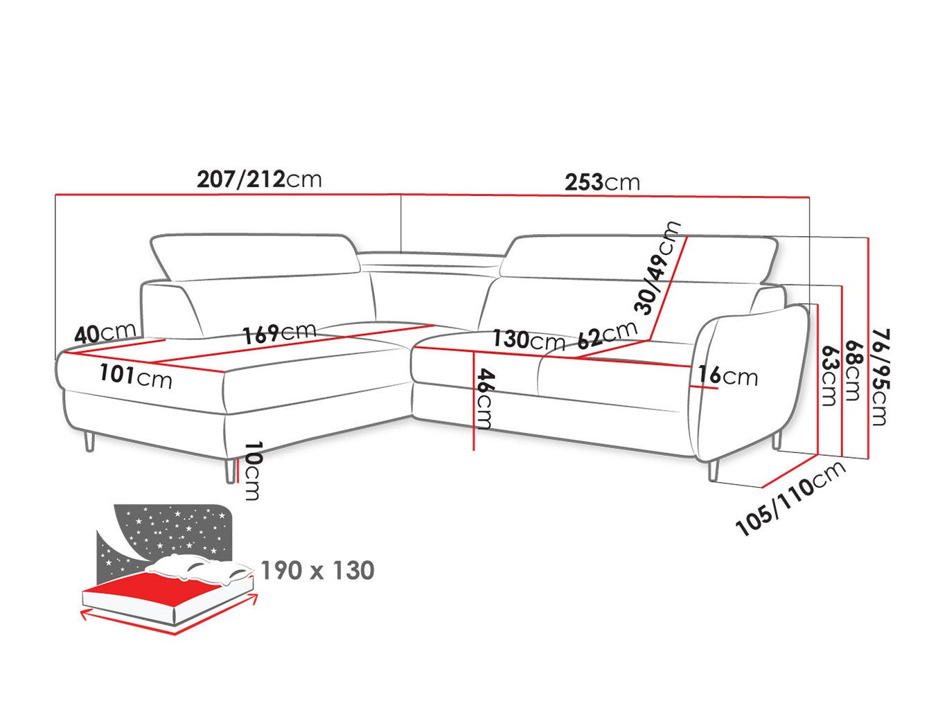 A fekvőfelület hossza190 cm