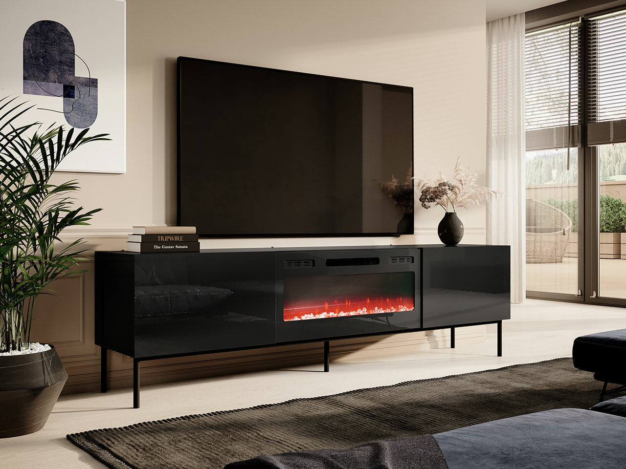 TV-állvány SLIDE K 200 (szekrény on a fém keret with a kandalló), Szín: Fekete + Fényes fekete, A kandalló színe: Fekete